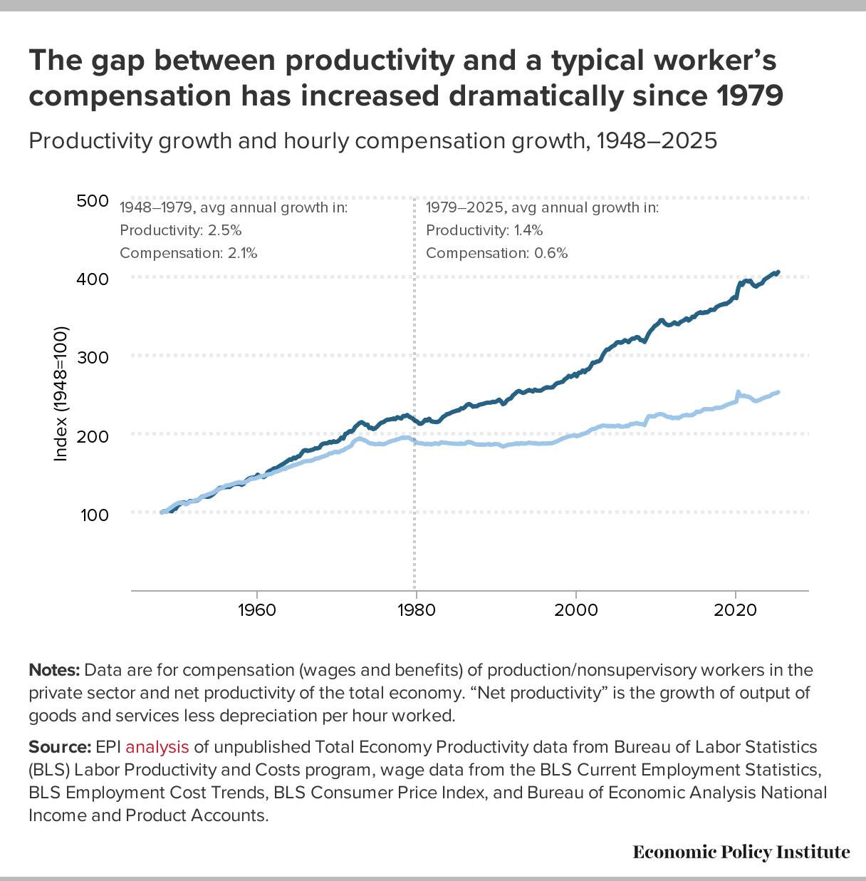 So when Porter treats UBI as a futuristic luxury that becomes plausible only after some imagined AI endpoint, he is historically backward. If anything, the 1970s were the time to begin. That was when wages first decoupled from productivity and growing insecurity and inequality became government policy.