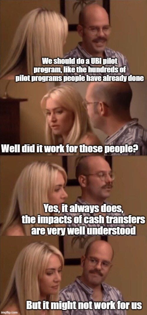 This article resonated with me because I've been saying the same thing for years—but what really excites me is that it's no longer just UBI advocates making this point. The frustration Katie expresses is becoming mainstream. "Of course that basic income pilot was a success" is turning into its own meme, because what else would you expect from the two hundredth study to reach the same conclusion? We've developed this strange habit of endlessly re-testing policies we already know work while refusing to actually implement them, and UBI is finally being recognized as exhibit A.