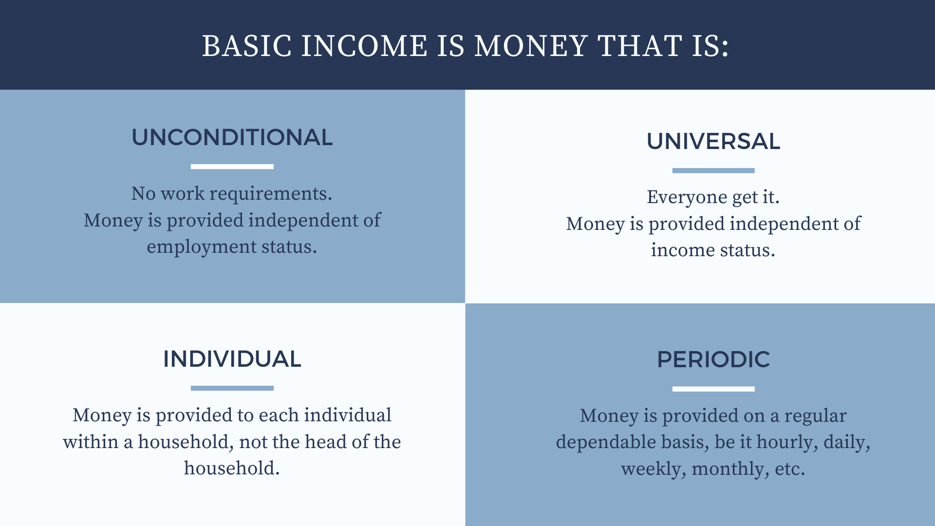 First of all, it’s important that everyone knows what UBI is and what it isn’t. To be considered UBI, a program must meet certain criteria. It must be an amount of money that is provided to everyone individually, without work requirements, on a regular recurring basis.