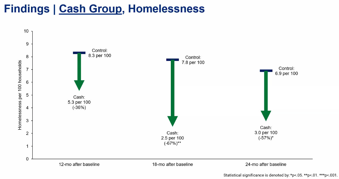 Not vouchers. Not services. Not case management alone. Cash. Unconditional cash directly into the hands of people experiencing or at risk of homelessness. And the results aren’t just good — they’re transformative.