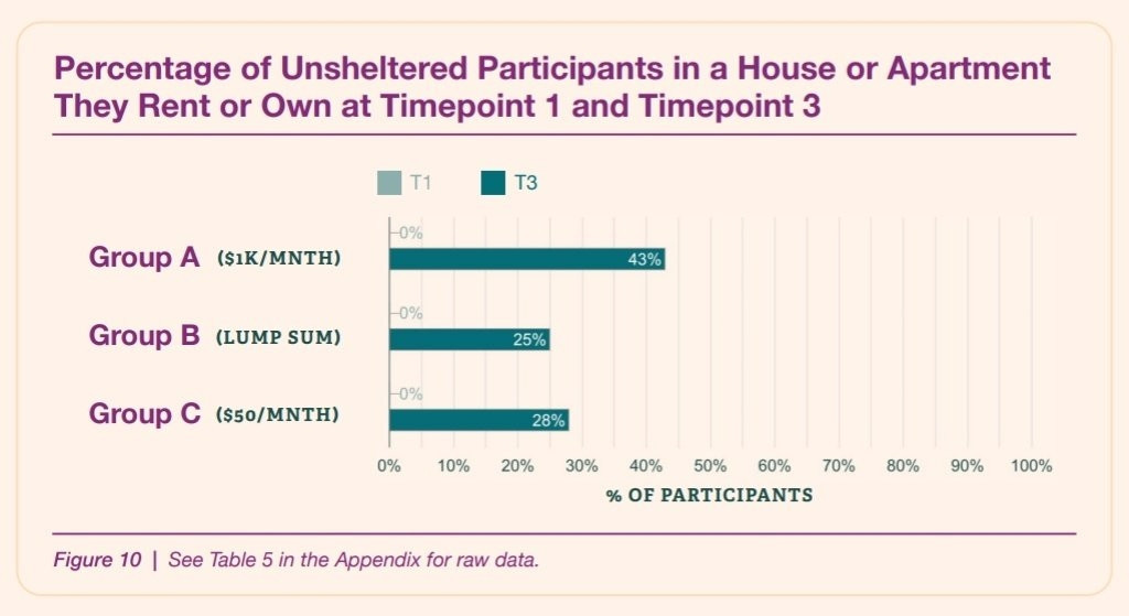 The program scaled up what looked promising in a small earlier pilot. In that initial Miracle Money pilot, 14 people received $500 per month for six months, and among those who were unhoused at entry, 67% secured stable housing.